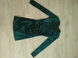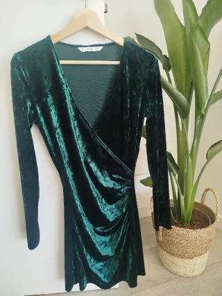 Elegante vestido de cóctel de Mango, confeccionado en un suave tejido de terciopelo. Usado en una sola ocasión. - Diseño cruzado con drapeado. - Manga larga. - Color verde intenso.
