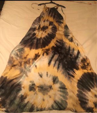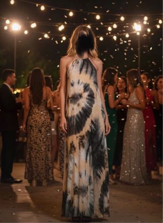 Vestido largo con estampado tie-dye de Zara. Un diseño llamativo y moderno. - Estampado tie-dye - Diseño largo - Cuello halter