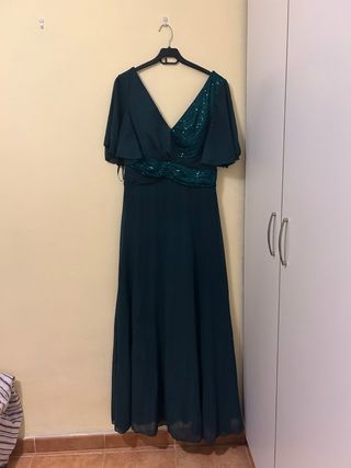 Elegante vestido largo de fiesta en color verde botella. Diseño escote pico y detalle de anilla metálica. - Corte drapeado en la cintura. - Falda larga y fluida.