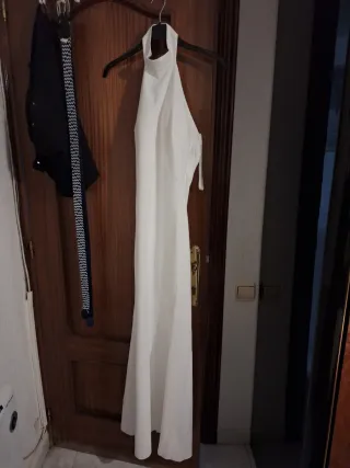 Elegante vestido largo de color blanco con diseño halter. - Corte asimétrico. - Espalda descubierta. - Cierre lateral.