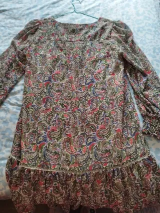 Vendo vestido original de Pepe Jeans London, talla M, en estado prácticamente nuevo (apenas usado). Es un vestido largo de color azul claro con estampado multicolor (tonos naranja, amarillo y azul marino). Tiene corte fluido, falda plisada, cinturón a juego para ajustar la cintura y un detalle abierto en la espalda con botón, muy favorecedor y elegante. Cuenta con forro y un botón extra de recambio. El tejido es ligero y cómodo, ideal para primavera/verano, eventos, cenas o incluso para el día a día con sandalias. Se vende por no darle uso.