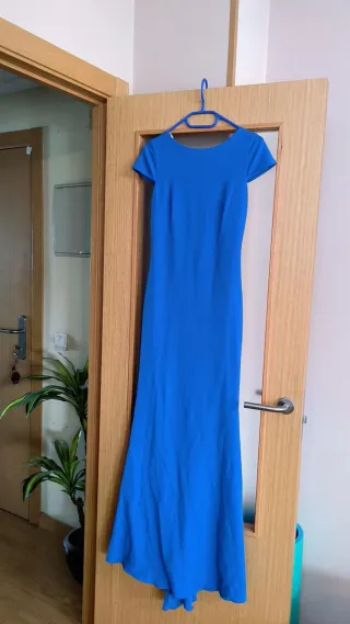 Precioso vestido azul eléctrico largo de corte elegante. - Espalda abotonada pronunciada en V. - Manga corta. Muy fresquito. - Falda larga y fluida con un poquito de cola. - Se vendieron muy pocas unidades.