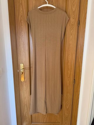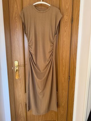 Vestido largo de tejido acanalado en color camel. Su diseño presenta un fruncido lateral que estiliza la figura. - Tejido acanalado. - Fruncido lateral.