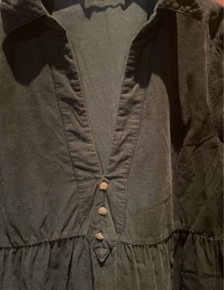 Vestido de pana con un bonito color verde oliva. - Diseño con cuello camisero. - Cierre de botones en la parte delantera. - Mangas largas. - Falda con volantes en capas.