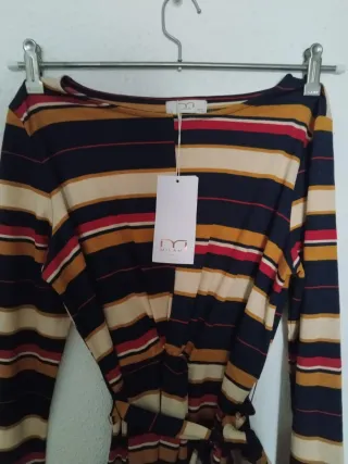 Vestido largo de rayas con cinturón. - Diseño de rayas horizontales y verticales. - Cinturón a juego para ajustar la cintura. - Manga larga. Aunque es talla S puede usarse también con M.