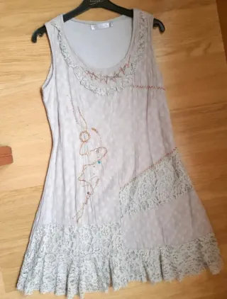 Vestido gris claro T. 2 con detalles en varios colores. Equivale a talla 38-40. Mide 41cm de cintura y +- 85cm de largo. Como nuevo, perfecto estado