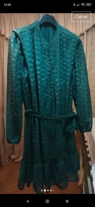 Elegante vestido largo de ceremonia, ideal para eventos especiales. Cuenta con un diseño sofisticado y detalles de pedrería. Muy bonito El color es el de la primera foto que sale mejor es verde botella Lleva pedrería en el cuerpo la parte de arriba Se abrocha con cremallera en la espalda Largo 155cm De hombro a hombro 48cm De sisa a sisa 50cm Cintura 44cm Largo manga 52cm - Mangas largas transparentes con pedrería. - Cuerpo superior con intrincado bordado y pedrería. - Falda larga y fluida. - Cierre de cremallera en la espalda. - Nuevo con etiqueta.