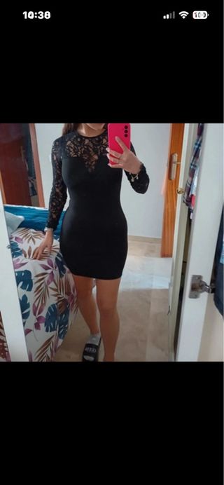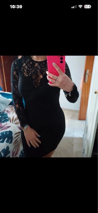 Vestido negro de manga larga con cuello alto y falda con vuelo. - Cremallera en la espalda. - Cintura marcada. - Puños abullonados. • La ropa se envía limpia. • Acepto hacer lotes de ropa.