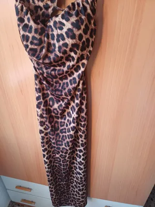 Vestido largo con estampado de leopardo. Diseño elegante y llamativo. - Escote cruzado. - Tirantes finos. - Tejido satinado.