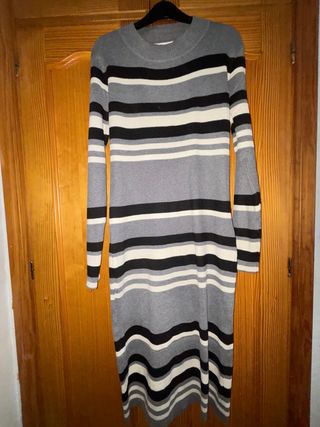 Vestido de punto largo con un diseño de rayas en diferentes tonos de gris y blanco. Es una prenda cómoda y versátil. - Diseño de rayas horizontales. - Manga larga. - Cuello redondo.