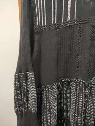 Vestido de Zara con un diseño moderno y detalles únicos. - Mangas largas. - Cuello con volantes. - Estampado de rayas verticales blancas. Está en perfecto estado. Queda anchito, tipo oversize, es una M grandecita. Es precioso.