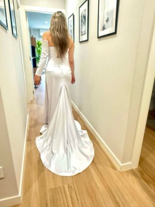 Vestido largo con un diseño moderno y llamativo. Perfecto para eventos especiales. - Tejido brillante con textura. - Corte asimétrico. - Aberturas laterales. - Mangas largas acampanadas.el vestido está de un solo uso de unas horas está prácticamente nuevo es de un tejido de pedrería pesada se amolda al cuerpo es espectacular *****