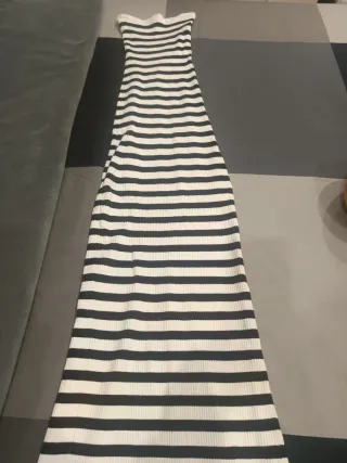 Vestido largo con un diseño de rayas horizontales en blanco y negro. Su corte es tipo palabra de honor, ideal para lucir en ocasiones especiales. - Diseño de rayas verticales. - Tejido elástico y cómodo.