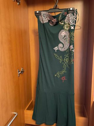 Vestido midi de lentejuelas con flecos en el bajo. - Diseño con tirantes finos y ajustables. - Largo midi. - Detalle de flecos en el dobladillo. - Todas las lentejuelas van cosidas. - Cremallera y ganchito traseros para cierre. - Forro de tela para que no pique. - SIN ESTRENAR, lo vendo porque estoy embarazada y no me vale.