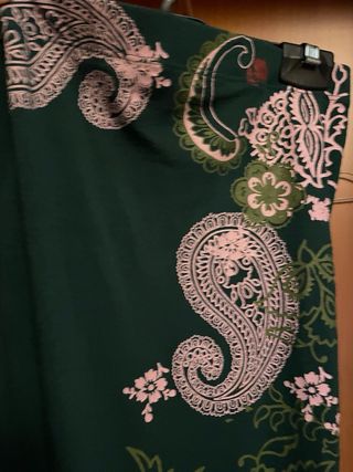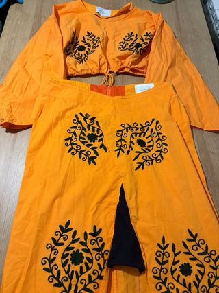 Conjunto de dos piezas de la marca IQ Collection. - Diseño con estampado floral. - Mangas acampanadas. - Cintura ajustable con cordón y detalle de borla. - falda larga con abertura lateral. Talla XL A la falda se la puso un trocito negro para que al andar no abriese tanto y fuera mas comoda