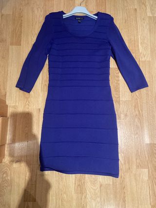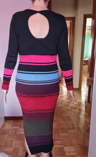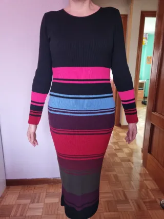 Vestido largo de punto fino, con diseño ajustado y muy favorecedor. Rayas en tonos negro, fucsia, azul y burdeos que estilizan la figura. Detalle de abertura en la espalda que le da un toque especial. Manga larga y tejido elástico. Ideal para otoño/invierno o entretiempo. Talla: 44, pero va ajustado (no talla amplio). 👉 Recomendable para quien use 44 justo o una 44 pequeña. Tejido: punto fino, elástico pero ceñido. Estado: muy bueno, sin defectos, sólo puesto 2 veces. Cualquier duda sobre medidas, pregúntame sin compromiso