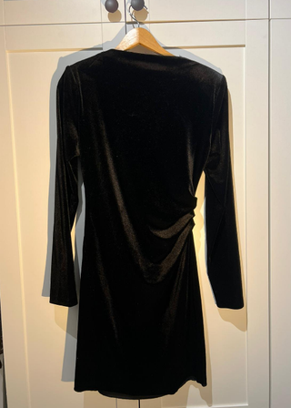 Elegante vestido de terciopelo con un diseño moderno. - Mangas largas. - Cuello drapeado lateral. - Hombros marcados.