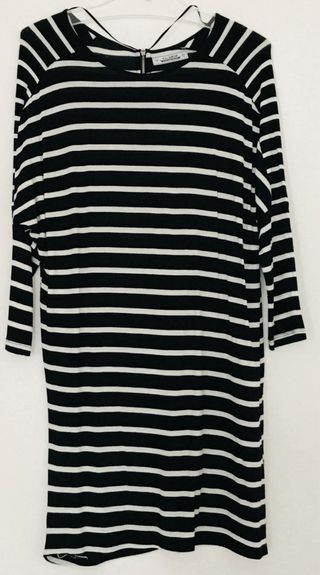 Vestido de rayas horizontales en blanco y negro. Es un vestido de punto ajustado. Vestido largo por debajo de las rodillas. - Diseño de rayas. - Manga larga. - Cuello redondo.
