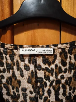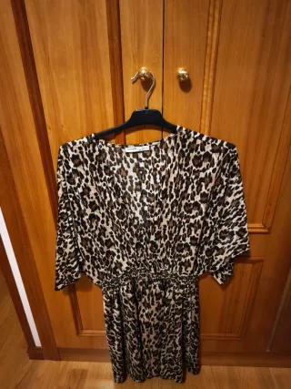 Vestido con estampado animal print de Pull&Bear. El diseño presenta un escote en V y cintura elástica. Está perfecto y sienta muy bien. - Mangas cortas. - Largo hasta la rodilla.