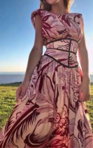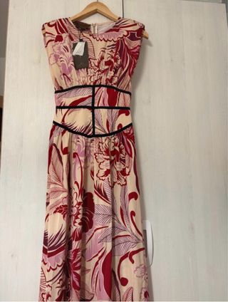 Vestido largo con un estampado vibrante y llamativo. - Diseño con cinturón negro. - Mangas cortas. - Escote en V. Descripción Vestido largo mid the iq collection color beige con estampado de flores en rosa y rojo burdeos talla s nuevo a estrenar, con etiqueta simula un corsé por lo que queda ideal hombreras en la parte baja de la cremallera de atrás tiene un punto un poco salido (ver foto) Modelo Lirio apenas apreciable #theigcollection #ig #invitadaideal #invitadaperfecta