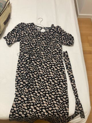 Vestido largo negro con un bonito estampado de flores en tonos blancos y rojizos. Tiene mangas cortas abullonadas y un cinturón a juego. - Largo midi. - Escote con abertura en la espalda. - Cinturón de tela.