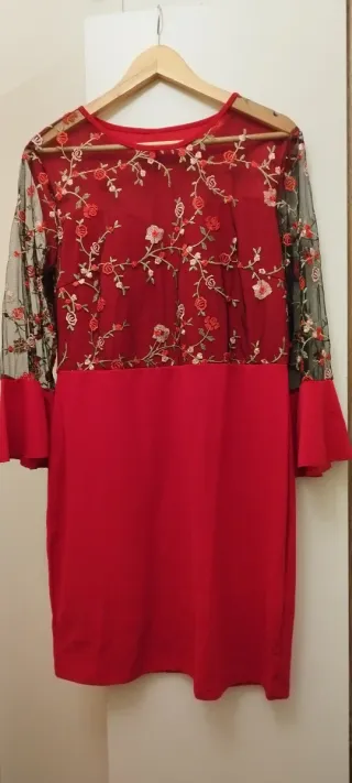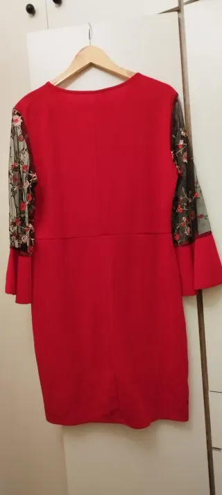 Elegante vestido rojo con detalles de encaje floral en la parte superior y mangas. - Diseño con escote redondo. - Mangas largas acampanadas. - Tejido principal liso y parte superior de encaje. - Largo hasta la rodilla.