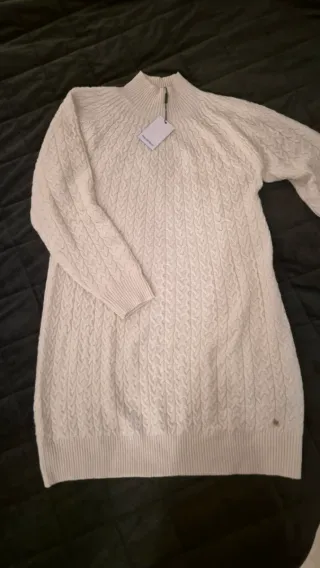 Vestido de punto con un diseño de trenzas, muy calentito. Color blanco roto. Nuevo con etiqueta. Largo hasta la rodilla. Talla L