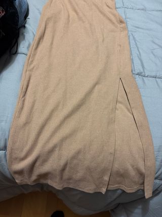 Vestido largo de tejido acanalado en color marrón. Tiene un diseño de tirantes finos y una abertura lateral. - Tirantes finos. - Abertura lateral. - Tejido acanalado.
