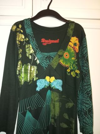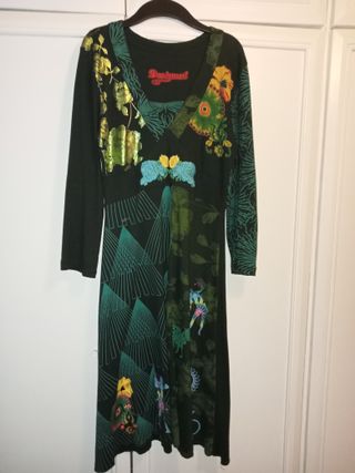 Vestido de manga larga con un diseño vibrante y original. Talla M (apox 40-42) - Estampado floral y geométrico. - Detalles bordados en la parte delantera. - Cuello en V. Marca DESIGUAL en perfecto estado. Aproximadamente hasta las rodillas, depende de la altura de la chica.. Tengo otros artículos de la marca: bolso, ropa niña ..