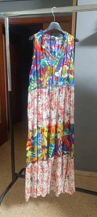 Vestido largo con un vibrante estampado floral y diseño de patchwork. Ideal para un look veraniego y fresco. - Diseño sin mangas. - Escote en V con detalle de lazada. - Cintura elástica. - Falda con varios volantes.