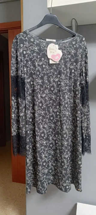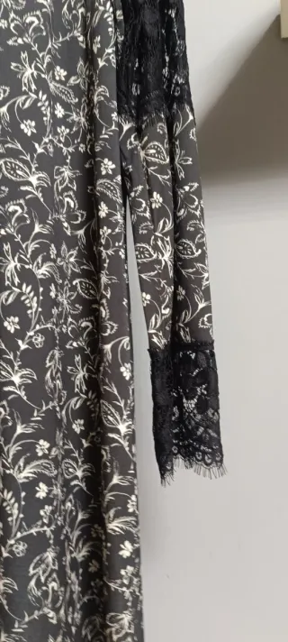 Vestido de manga larga con un estampado floral en blanco sobre fondo negro. Presenta detalles de encaje en las mangas. - Estampado floral. - Mangas largas con encaje.