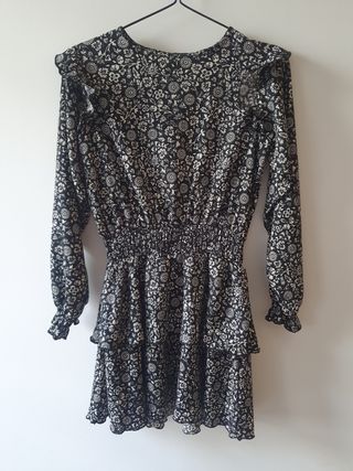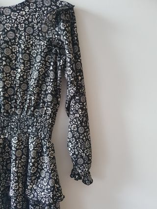 Vestido de manga larga con un bonito estampado floral. El diseño es versátil y cómodo. - Estampado de flores en tonos beige y negro. - Manga larga con detalle. - Talla S.