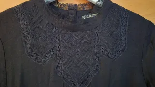 Vestido negro de manga 3/4 de la marca IKKS. Presenta un diseño elegante con detalles de encaje en el cuello y las mangas. - Cuello alto con detalle de encaje. - Mangas largas con puños acampanados y encaje. - Cuerpo con pinzas verticales. - Falda con vuelo y fruncido en la cintura.