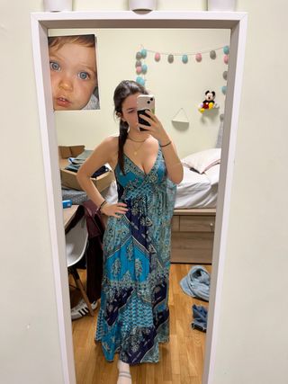 Vestido largo con estampado floral, ideal para lucir un estilo único.Lo compré en Tailandia porque es apto para entrar a los templos. Hombros cubiertos y largo. Es muy fresco y tiene mucho vuelo. La cintura se ajusta. El escote tiene unas tiras que puedes apretar para tener mayor o menor escote. Hecho en Tailandia. Talla única pero yo suelo ser M y me va grande si no ajusto las tiras, podría valer para S y L también. - Estampado vibrante con flores. - Corte fluido y cómodo.