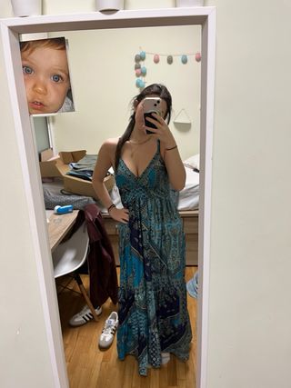 Vestido largo con un estampado bohemio vibrante. Ideal para un estilo relajado y con personalidad. Es de unatienda local. La marca no esta en el desplegable - Diseño con tirantes finos. - Escote pronunciado. - Detalle de tiras en la espalda. - Adornado con borlas.