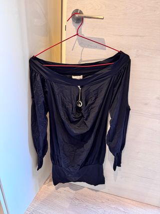 Vestido negro de manga larga con diseño moderno. - Corte ajustado. - Escote con hombros descubiertos. Vestido largo elástico para ajustar al cuerpo , muy sexy De largo mide unos 105 cm Queda muy bonito puesto