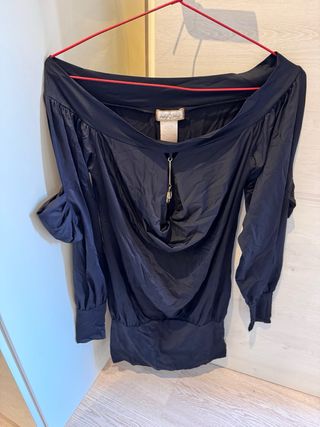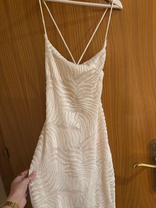 Vestido elegante de corte moderno con hombros descubiertos. • Largo: 90cm. -Desgaste en la parte de abajo por estar guardado. - Diseño con cremallera frontal. - Abertura en la parte inferior.