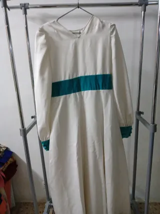 Vestido largo de color blanco con un detalle de banda horizontal en color turquesa en la cintura. Las mangas son largas y los puños también tienen un detalle en turquesa. - Diseño elegante y moderno. - Largo hasta los tobillos. - Ideal para ocasiones especiales.
