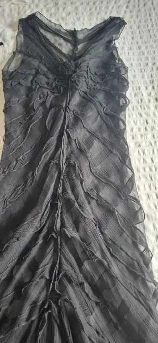 Elegante vestido negro con detalles de volantes. - Diseño con escote en V. - Tejido ligero y vaporoso. - Ideal para fiestas y eventos especiales.