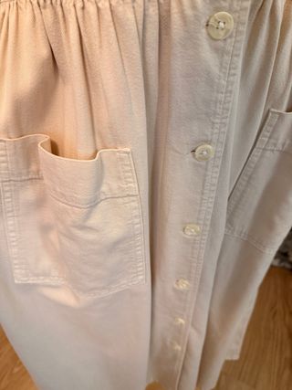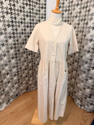 Vestido largo de la marca Monkl en color beige. Presenta un diseño con cuello alto y botones. - Cuello alto. - Cierre de botones. - Bolsillos frontales.