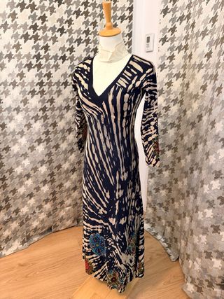 Vestido largo de la marca Desigual con un llamativo estampado. - Diseño con escote en V. - Mangas largas. - Estampado abstracto y floral en la parte inferior.