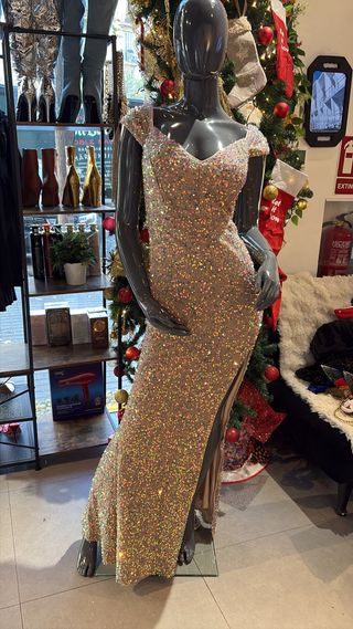 Vestido largo con un diseño deslumbrante cubierto de lentejuelas. - Diseño con escote. - Abertura lateral. - Acabado brillante. Preguntar el valor varios precios