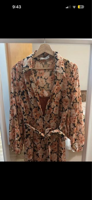 Vestido camisero largo con un bonito estampado floral. Tiene manga larga y cinturón. - Estampado de hojas y flores. - Cierre de botones. - Cinturón a juego.