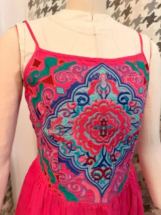 Vestido con un vibrante diseño bordado en el corpiño y una falda lisa. - Corpiño con intrincado bordado floral y geométrico. - Tirantes finos. - Falda larga y fluida.