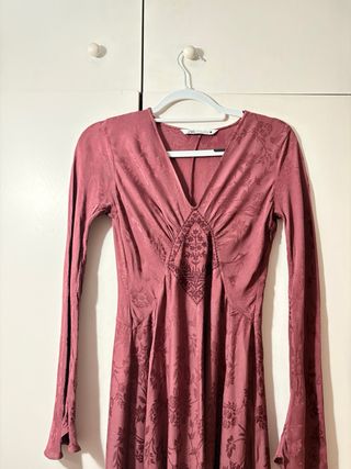 Vestido largo de Zara con estampado jacquard. - Manga larga acampanada. - Escote en pico. - Detalle fruncido en la cintura.