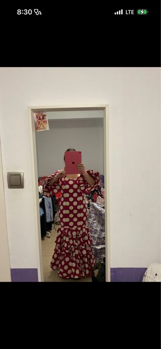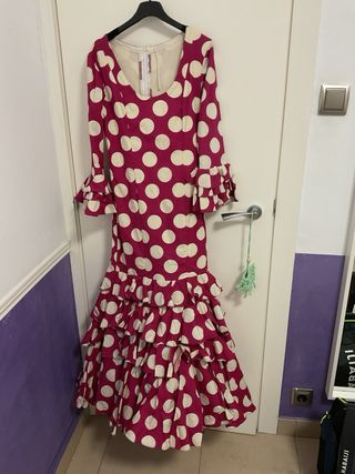 Vestido de flamenca con un diseño llamativo. - Estampado de lunares blancos sobre fondo rojo. - Mangas abullonadas. - Volantes en la falda. Sin estrenar Talla 36 puede llegar a talla 38 Tiene para sacar Hecho a mano Cadera 102 Pecho 93 1,37 de largo Medidas aprox