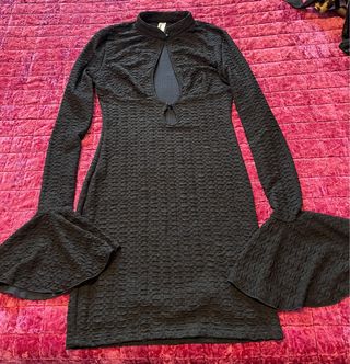 Vestido negro con un diseño texturizado y mangas acampanadas. - Cuello alto. - Abertura en el escote. - Mangas largas con campana. - Tejido con relieve.