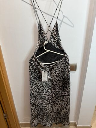 Vestido largo con estampado animal print. - Diseño con tirantes finos cruzados en la espalda. - Tejido satinado con caída. - Estampado de leopardo en tonos beige y negro.