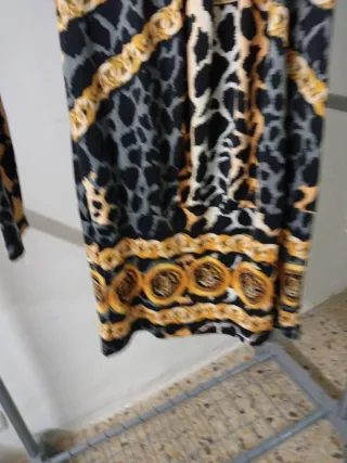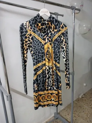 Vestido con un llamativo estampado que combina varios colores y detalles dorados. - Diseño con cuello alto. - Manga larga. - Estampado de leopardo y motivos barrocos dorados.