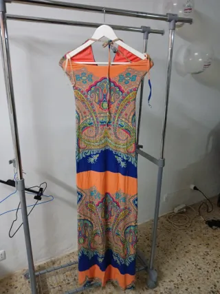 Vestido largo con un diseño vibrante y detalles únicos. - Estampado paisley en tonos naranja y azul. - Adornado con chaquiras en la zona del escote. - Diseño tipo halter con tiras para anudar al cuello.